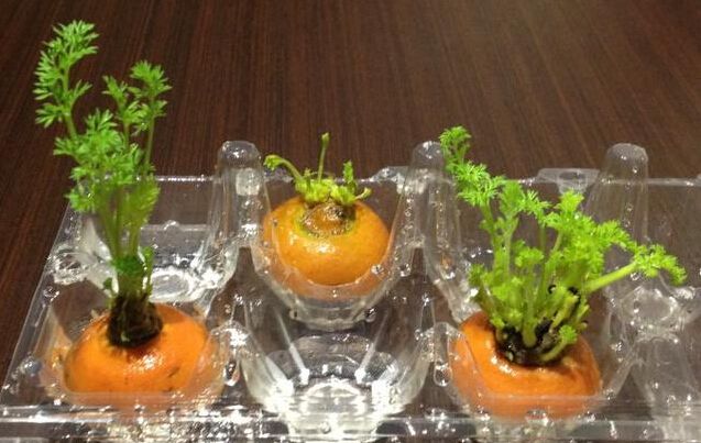胡蘿卜的蒂需要很久才會生根、發芽,但發芽以后的生長速度很快。它們會先長出莖,直到莖長得很高才會慢慢抽出新芽,長出枝葉。