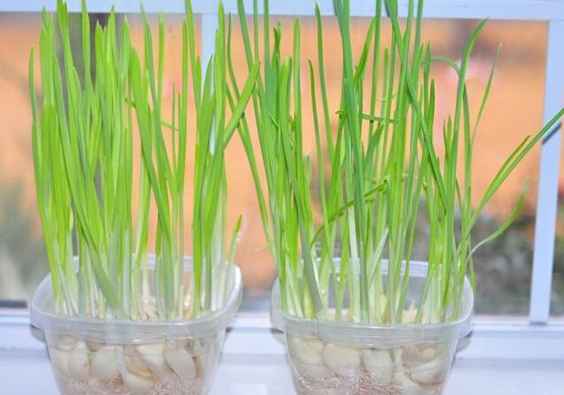 將大蒜放入容器,只須倒入少許水,淹沒蒜根部,一段時間過后,就能長出繁茂青翠的蒜苗了。